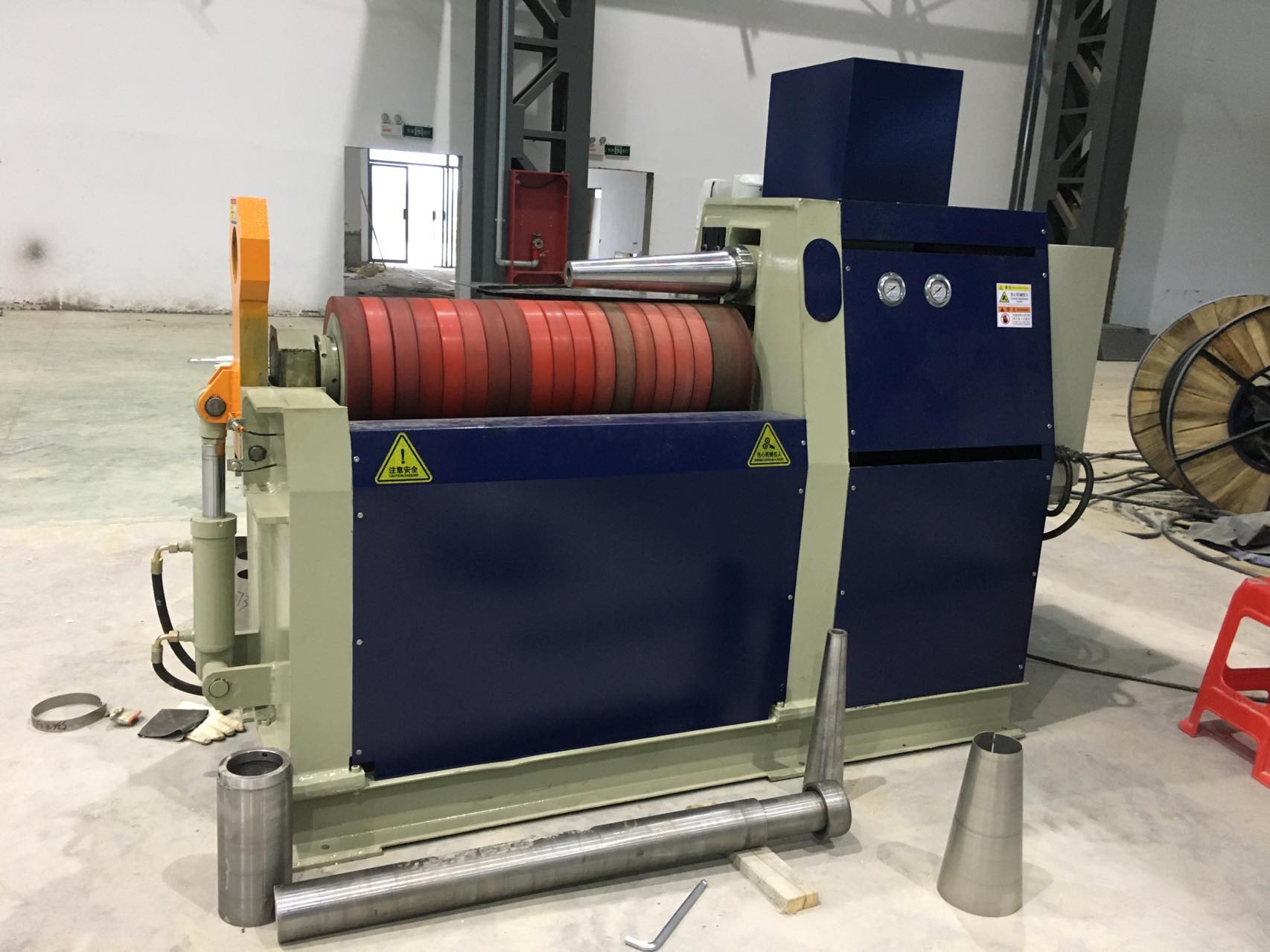 二辊卷板机为我公司生产的技术产品。其一辊为钢辊,另一辊为钢辊芯外包弹性层,板材置于两辊间并调整其间距,使其接触——加压——胶辊变形,板材随之局部变形,驱动两辊旋转,使板材连续弯卷成型。板料一次卷制即可加工成型,无明显直边,卷圆精度高。是高效、高精度、高度自动化的卷板加工设备。